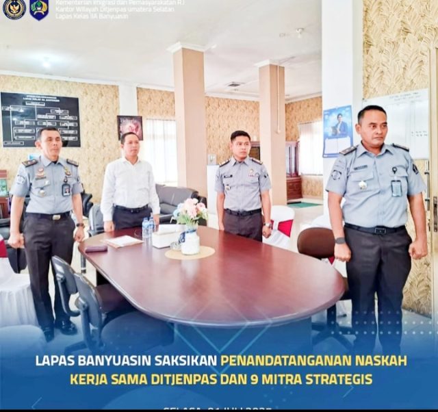 SWARNANEWS.CO.ID, BANYUASIN – Lembaga Pemasyarakatan (Lapas) Kelas IIA Banyuasin mengikuti kegiatan Penandatanganan Naskah Kerja Sama antara Direktorat Jenderal Pemasyarakatan (Ditjenpas) dengan sembilan mitra strategis secara virtual, Rabu(2/7/2025)
