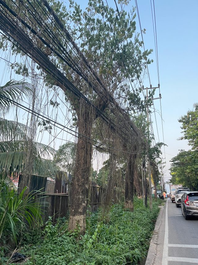 Kondisi semakin diperparah dengan keberadaan pohon-pohon besar di bahu jalan yang turut dijadikan penopang darurat. Terlihat akar gantung dan ranting pohon terselimuti lilitan kabel yang sangat banyak.