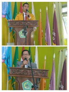Ketua STAI BS Lubuklinggau dua periode, Ngimadudin, S.Ag, MH (atas) menyampaikan sambutan. Ketua Panitia Pelaksana Pemilihan Ketua (P3K) STAI BS Lubuklinggau sekaligus perwakilan Yayasan Pembina Pendidikan Tinggi Musi Rawas, Rehal Ikmal, SH, M.Si ketika menyampaikan pidato, di Aula Kampus STAI BS Lubuklinggau, Senin, (13/10/2025).