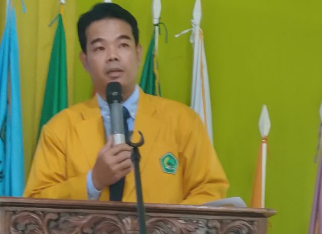 CALON Ketua Sekolah Tinggi Agama Islam Bumi Silampari (STAI BS) Lubuklinggau Masa Bhakti 2025-2029, Dr Muhammad Yunus, S.Pd.I, M.Pd.I, sedang menyampaikan paparan visi dan misinya di hadapan anggota senat dan pihak Yayasan Pembina Pendidikan Tinggi Musi Rawas di Aula Kampus STAI BS Lubuklinggau, Senin (13/10/2025). Foto: Rehan Akil, Swarnanews.co.id.
