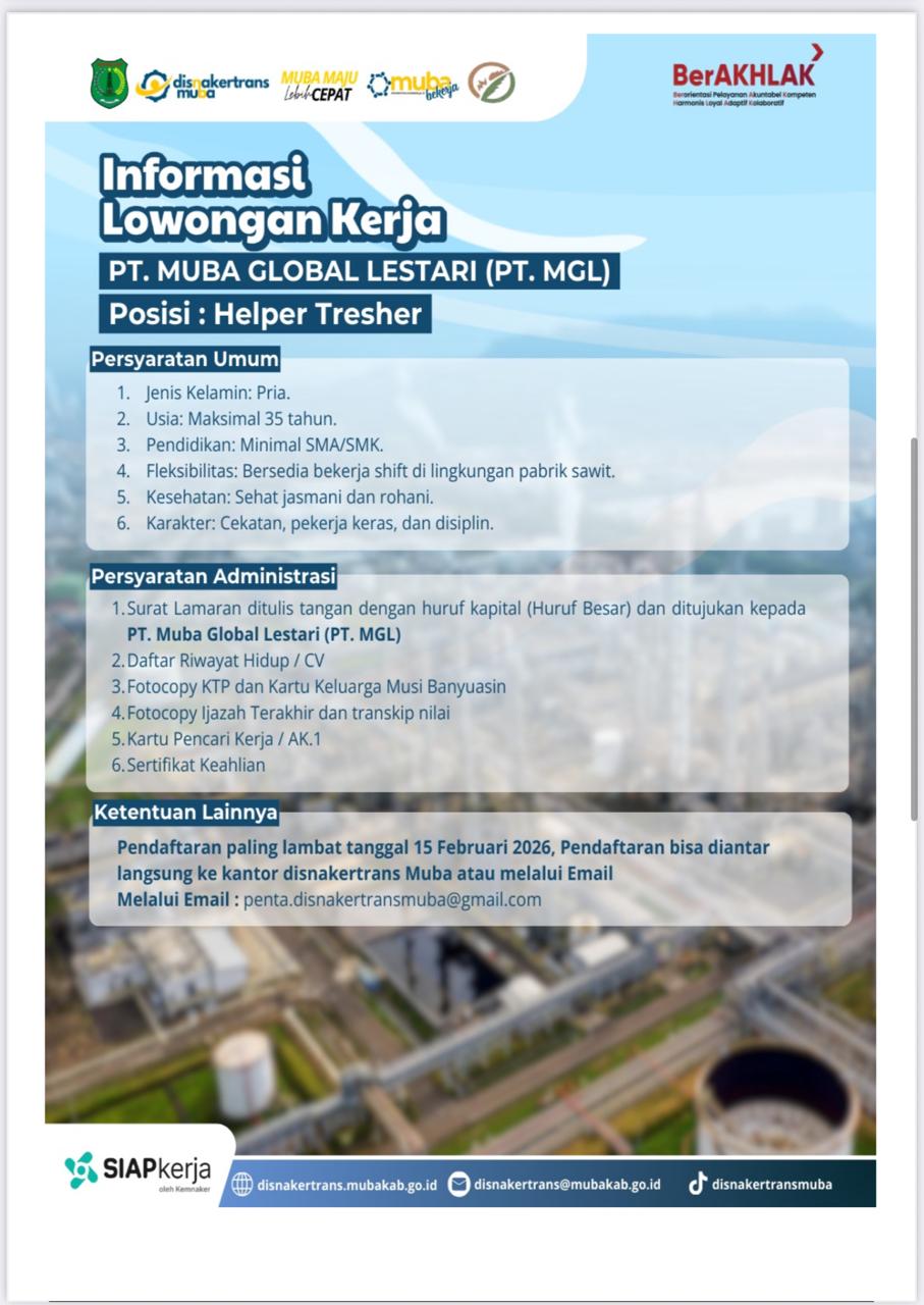 Lowongan di PT MGL ini merupakan implementasi dari Peraturan Daerah (Perda) Musi Banyuasin Nomor 2 Tahun 2020 tentang Pemberdayaan dan Penempatan Tenaga Kerja.