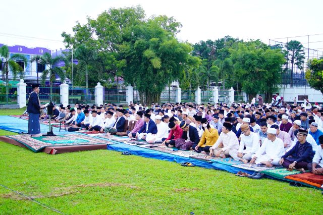 “Alhamdulillah kita dipertemukan di hari kemenangan setelah satu bulan penuh berpuasa, menahan segala hawa dan nafsu. Tibalah kita di hari kemenangan, Hari Raya Idul Fitri 1447 H / 2026 M,” tutur Bupati Musi Banyuasin H. M. Toha Tohet, saat menyapa masyarakat Muba yang ramai mengikuti sholat idul Fitri di Halaman Pendopoan