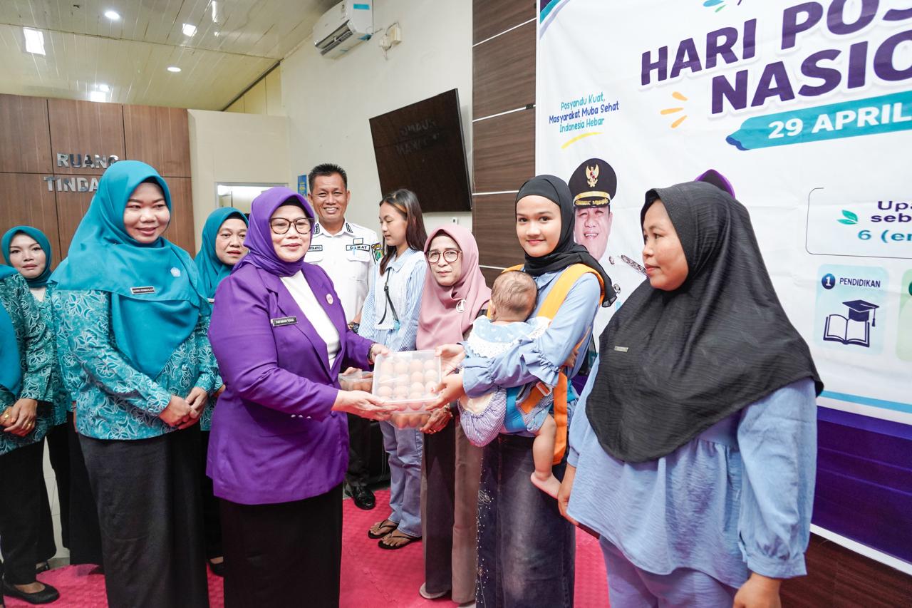 Ketua Tim Penggerak PKK Muba, Hj Patimah Toha, yang juga menjabat sebagai Ketua Tim Pembina Posyandu, menghadiri langsung kegiatan Posyandu berbasis 6 Standar Pelayanan Minimal (SPM) yang digelar di Rumah Cinta Serasan Sekate TP PKK Muba, Rabu (29/4/2026).